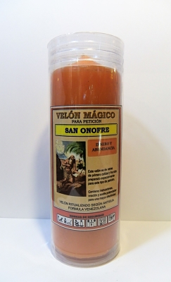 Velón esotérico ritualizado para ofrenda a San Onofre. Peticiones de dinero urgente y abundancia.